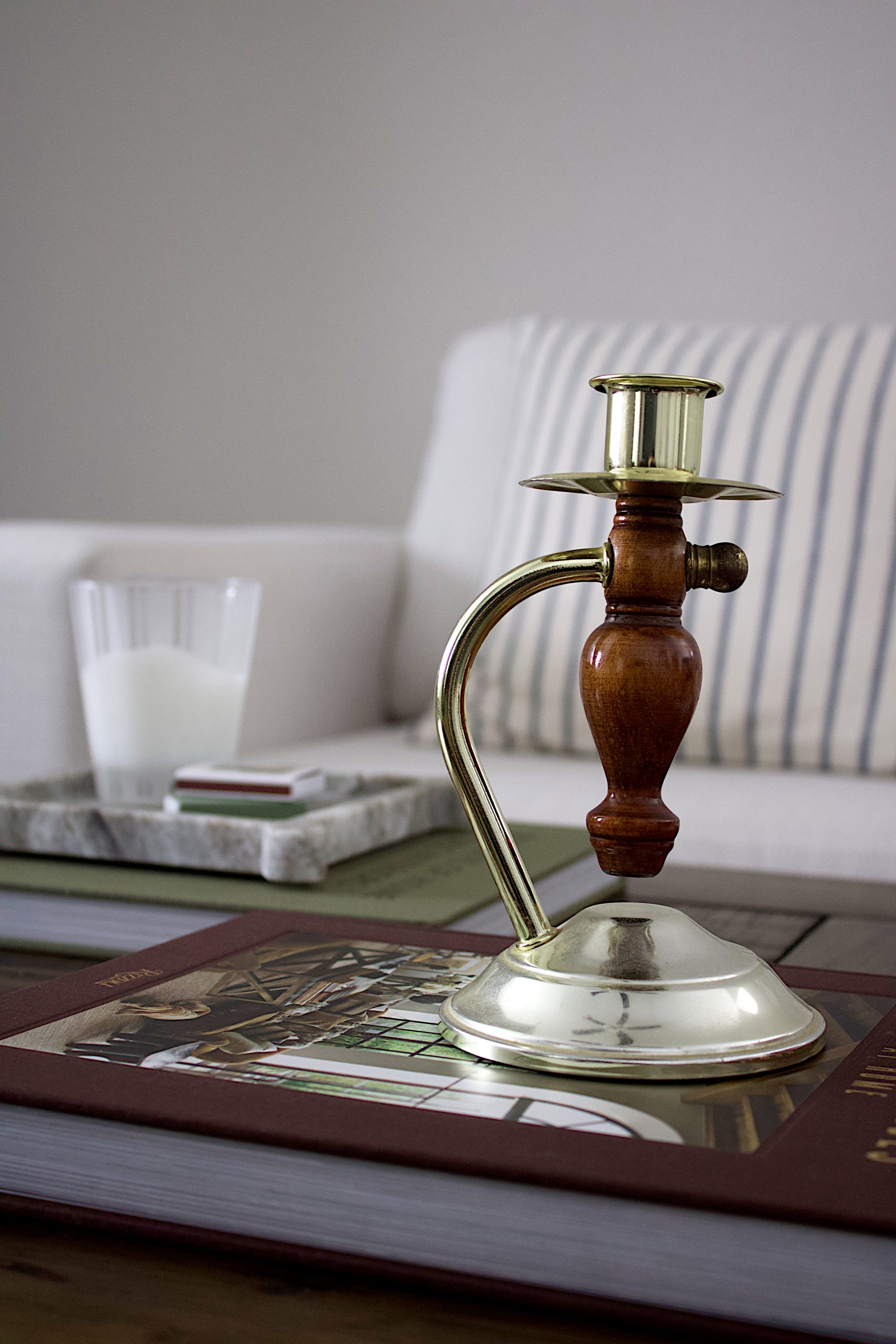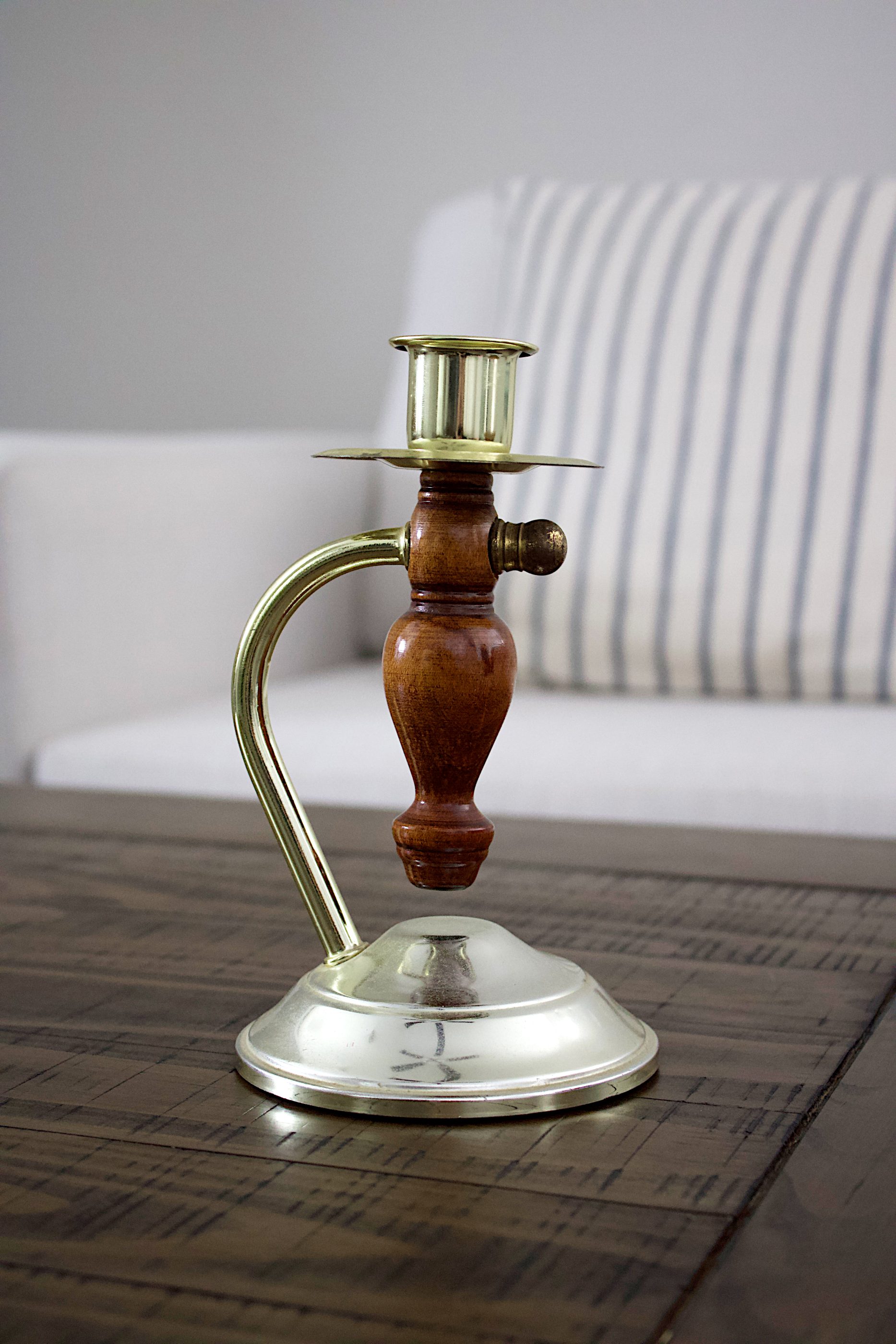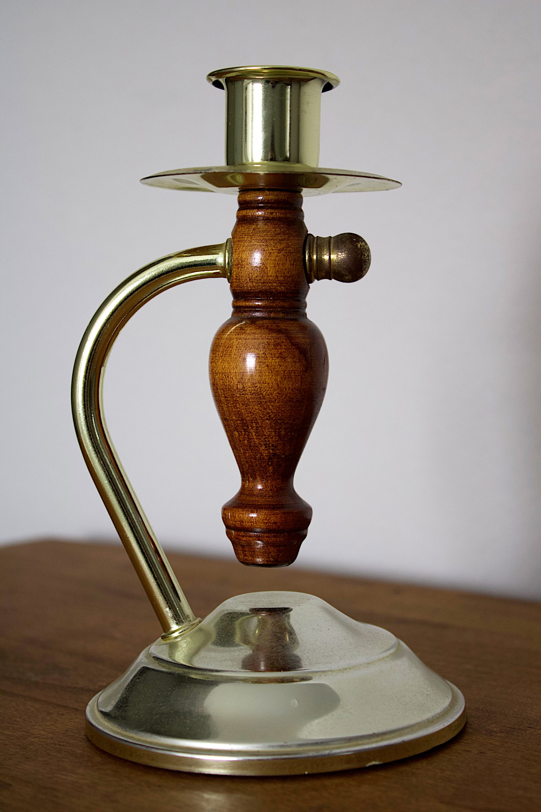 A single vintage candlestick crafted from turned wood with brass detailing. Warm in tone and classic in form, this piece adds timeless character to shelves, mantels, and tables. Holds a standard taper candle and shows natural patina consistent with age.